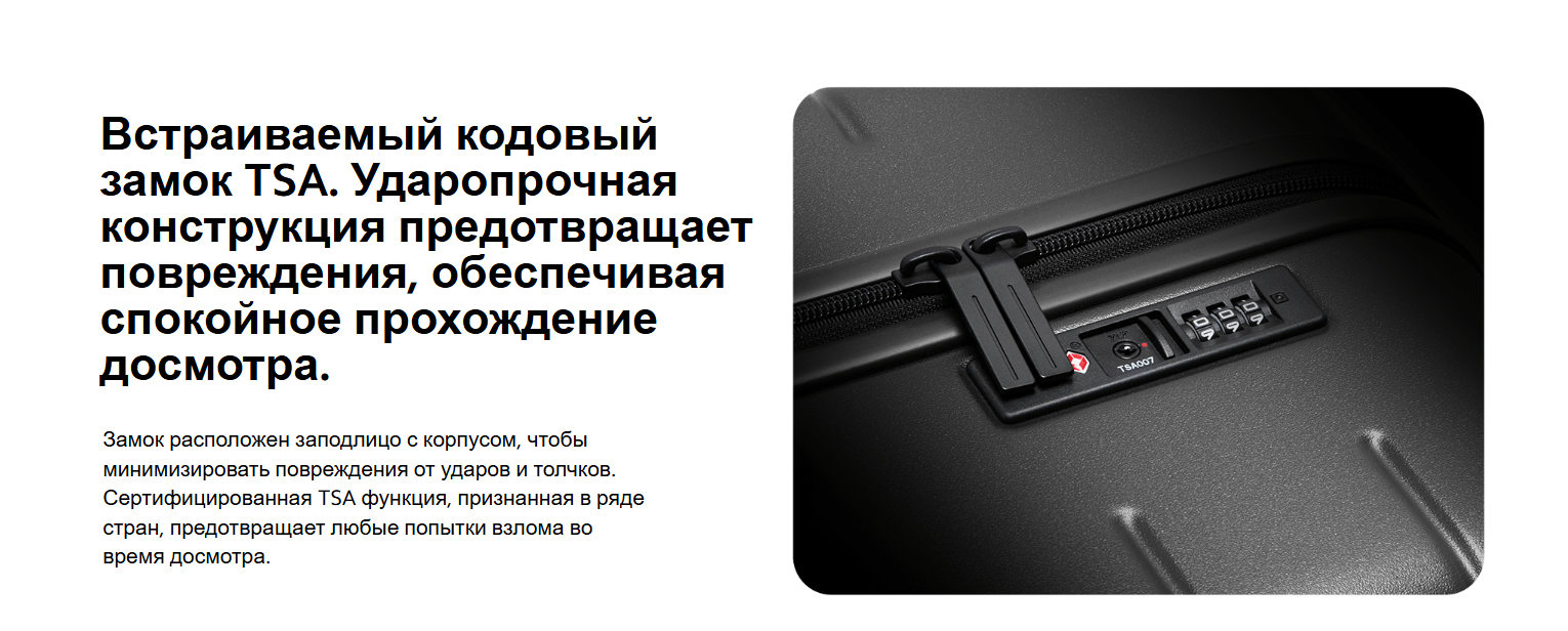 Чемодан изготовлен из поликарбоната, который помогает сочетать прочность конструкции с умеренным весом. Среди защитных функций предусмотрены замок TSA и молния с защитой от разрыва, что делает использование модели более надежным в дороге и повышает сохранность содержимого во время поездок.